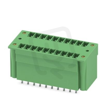 Zásuvka konektoru desky plošných spojů, jmenovitý průřez: 1,5 mm², barva: zelená, jmenovitý proud: 8 A, jmenovité napětí (III/2): 160 V, povrch kontaktů: Sn, typ kontaktu: Trn, počet potenciálů: 20, počet řad: 2, počet pólů: 10, počet přípojek: 20, řada výrobků: MCDV 1,5/..-G1F, rozteč: 3,81 mm, montáž: Vlnové pájení, pin-layout: Lineární pinning, délka pinu [P]: 3,4 mm, počet pájecích kolíků na každý potenciál: 1, systém zásuvných hlavic: COMBICON MC 1,5, Orientace tvaru konektoru: Standardní, zajištění: Šroubový zámek, způsob upevnění: Závitová příruba, způsob balení: zabaleno v krabici, U kombinace se zástrčkami MCV je vždy nutné použít zástrčku MCVW a MCVR.