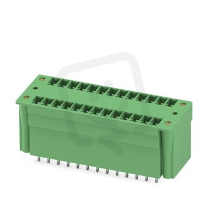 Zásuvka konektoru desky plošných spojů, jmenovitý průřez: 1,5 mm², barva: zelená, jmenovitý proud: 8 A, jmenovité napětí (III/2): 160 V, povrch kontaktů: Sn, typ kontaktu: Trn, počet potenciálů: 26, počet řad: 2, počet pólů: 13, počet přípojek: 26, řada výrobků: MCDV 1,5/..-G1F, rozteč: 3,81 mm, montáž: Vlnové pájení, pin-layout: Lineární pinning, délka pinu [P]: 3,4 mm, počet pájecích kolíků na každý potenciál: 1, systém zásuvných hlavic: COMBICON MC 1,5, Orientace tvaru konektoru: Standardní, zajištění: Šroubový zámek, způsob upevnění: Závitová příruba, způsob balení: zabaleno v krabici, U kombinace se zástrčkami MCV je vždy nutné použít zástrčku MCVW a MCVR.