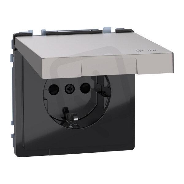 Zásuvka SCHUKO, Merten System D, s výklopným víčkem IP44, clonky, bezšroubová, nikl kovová, 16 A, 250 V, kov