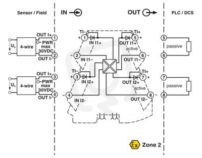 2kanálový 2cestný oddělovač napájený ze vstupní smyčky s výměnnou technikou připojení pro galvanické oddělení analogových signálů. Vstupní signál = výstupní signál: 0(4) mA ... 20 mA. Technika připojení push in.