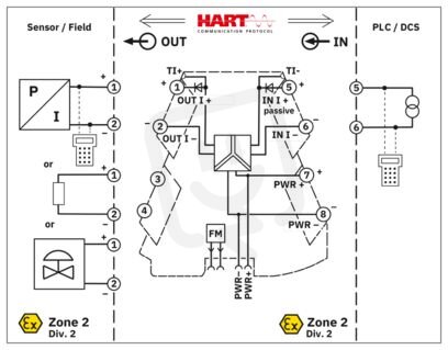 Výstupní oddělovací zesilovač pro oddělení a přenos signálů 0 mA / 4–20 mA z řídicí jednotky k jiskrově bezpečné zátěži do oblasti s nebezpečím výbuchu. Transparentnost pro HART, napětí při běhu naprázdno: 27 V DC, Standardní konfigurace, 3cestné oddělení, Šroubové připojení