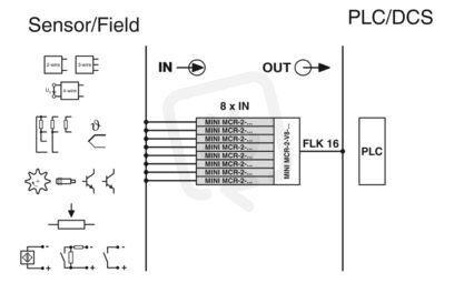 Osm MINI Analog Pro oddělovacích zesilovačů a měřicích převodníků může být pomocí systémových adaptérů a systémové kabeláže připojeno k ovládání s minimálními náklady na kabeláž a zcela bezchybně.