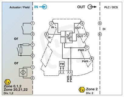 Ex i-Oddělovací zesilovač NAMUR pro provoz přepínačů a bezdotykových iniciátorů přiblížení. Signály jsou přenášeny pasivně přes 1 elektronické relé na výstupu k úrovni řížení. počet kanálů: 1, Standardní konfigurace, Detekce chyb ve vedení, Safety Integrity Level (SIL, IEC 61508): 3, Svorky Push-in