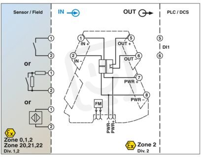 Ex i-Oddělovací zesilovač NAMUR pro provoz přepínačů a bezdotykových iniciátorů přiblížení. Signály jsou přenášeny přes jeden tranzistorový výstup (pasivní) k úrovni řížení. Standardní konfigurace, Detekce chyb ve vedení, Safety Integrity Level (SIL, IEC 61508): 3, Šroubové připojení