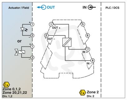 Ex i-Modul řízení ventilu pro ovládání elektromagnetických jiskrově bezpečných ventilů v oblasti s nebezpečím výbuchu. napětí při běhu naprázdno: 23 V DC, proudové omezení: 38 mA, Standardní konfigurace, napájení ze smyčky, Safety Integrity Level (SIL, IEC 61508): 3, Šroubové připojení