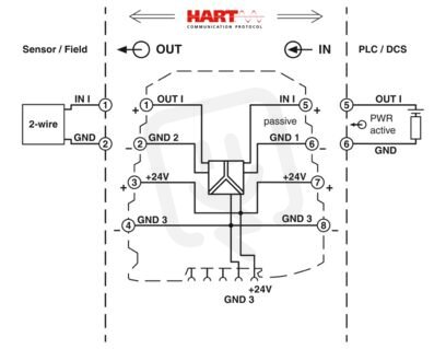Třícestný výstupní oddělovací zesilovač k přenosu signálů 0/4 ... 20 mA z řídicí jednotky k zátěži v poli při současném galvanickém třícestném oddělení mezi vstupem, výstupem a napájením, se šroubovým připojením