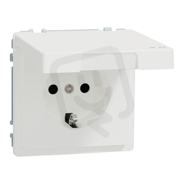 Zásuvka SCHUKO, Merten System D, s výklopným víčkem IP44, clonky, bezšroubová, nordic white, 16 A, 250V AC, termoplast