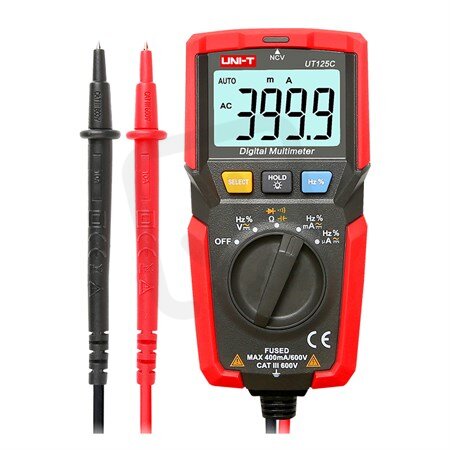 Spolehlivý kapesní multimetr s digitálním displejem, který zobrazí až 4000 číslic. Ideální nástroj pro měření stejnosměrného i střídavého napětí a proudu, odporu, kapacity a spojitosti vedení s ochranou proti přetížení. V této cenové relaci je přístroj navíc vybaven nadstandardními funkcemi, mezi které patří bezkontaktní měření napětí (NCV), měření frekvence a podsvícení displeje. UT125C vyhovuje standartu CAT III 600V a certifikátu cETLus.