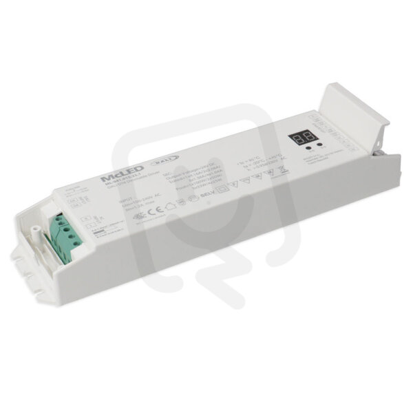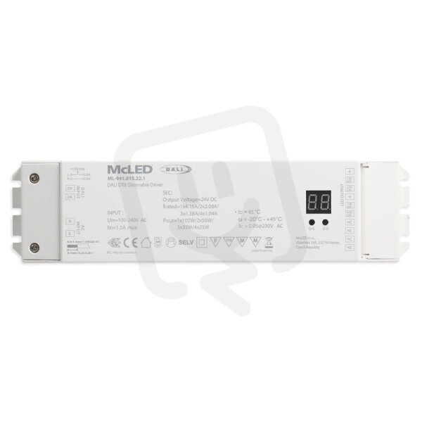 Stmívatelný napěťový zdroj pro LED pásky - výkon 100W, výstupní napětí DC 24V, proud max. 4,1A. IP20. Čtyři výstupní kanály. Vstupní napětí 200 - 240V AC, materiál krytu: plast. Rozměry 244x64x32mm, hmotnost 452g. Stmívání pomocí DALI nebo tlačítkem. Při výběru zdroje počítejte s výkonovou rezervou min. 20%. Doba náběhu cca 0,5 - 2s. Certifikace: CE, SELV, F.