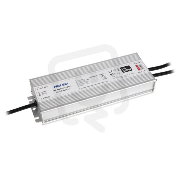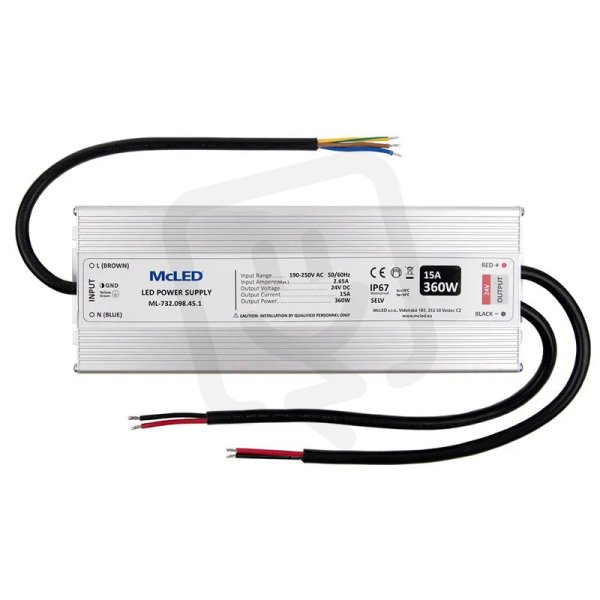 LED napěťový zdroj pro LED pásky 360W, krytí IP67, výstup 24VDC, 15A. Vstup: 170-250VAC, 47-63Hz, materiál krytu: hliník. Rozměry: 260x90x40mm, hmotnost: 1520g. Zdroj SELV. Zdroj má 2 výstupy, každý lze zatížit max. 7,5A. Při výběru zdroje počítejte s výkonovou rezervou min. 20%.