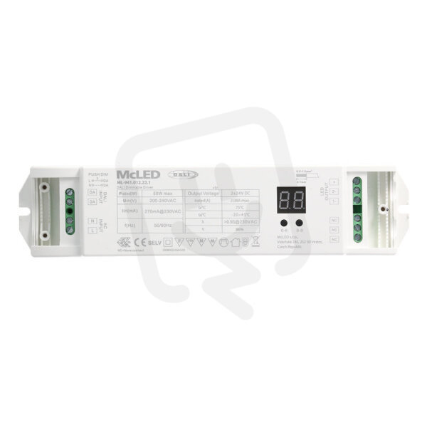 Stmívatelný napěťový zdroj pro LED pásky - výkon 50W, výstupní napětí DC 24V, proud max. 2,08A. IP20. Dva výstupní kanály. Vstupní napětí 200 - 240V AC, materiál krytu: plast. Rozměry 210x50x32mm, hmotnost 248g. Stmívání pomocí DALI nebo tlačítkem. Při výběru zdroje počítejte s výkonovou rezervou min. 20%. Doba náběhu cca 0,5 - 2s. Certifikace: CE, SELV, F.