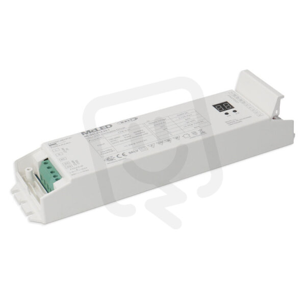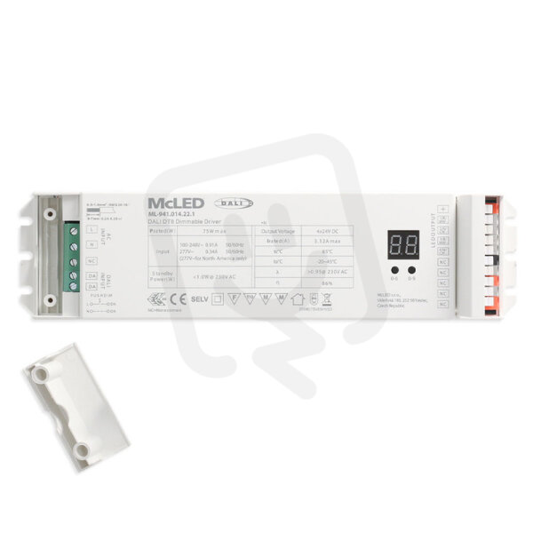 Stmívatelný napěťový zdroj pro LED pásky - výkon 75W, výstupní napětí DC 24V, proud max. 3,125A. IP20. Čtyři výstupní kanály. Vstupní napětí 200 - 240V AC, materiál krytu: plast. Rozměry 244x64x32mm, hmotnost 460g. Stmívání pomocí DALI nebo tlačítkem. Při výběru zdroje počítejte s výkonovou rezervou min. 20%. Doba náběhu cca 0,5 - 2s. Certifikace: CE, SELV, F.