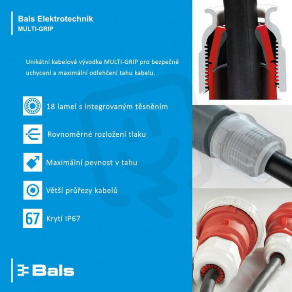 unikátní kabelová vývodka MULTI-GRIP s integrovaným těsněním a spolehlivým odlehčením tahu kabelu. Pevnost v tahu mnohonásobně překračuje hodnoty požadované normami IEC 60309, EN 60309 a VDE 0623. Vývodka MULTI-GRIP s ochranou proti samovolnému povolení vlivem vibrací, nebo teplotních rozdílů, vhodná i do náročných klimatických podmínek, odolná prachu a mastnotě. Vývodka dosahuje třídy ochrany min. IP67
