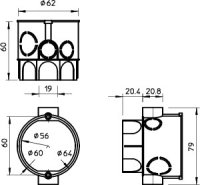 Přístrojová / propojovací krabice se zaručenou normalizovanou středovou roztečí přístrojů 71 mm (dle DIN 49 073-1) a ochranou proti pootočení pomocí spojky Snap-Rast. Vylomitelné otvory pro vedení a trubky ∅ 20 mm a ∅ 25 mm. Kombinovatelné rozpěrné a šroubové upevnění, hluboko umístěné omítkové držáky, vzdálenost šroubů přístroje 60 mm, pro šroubové upevnění pomocí samořezných šroubů 3,2 mm, s 2 nálitky pro šrouby, bez šroubů, stupeň krytí IP20.
