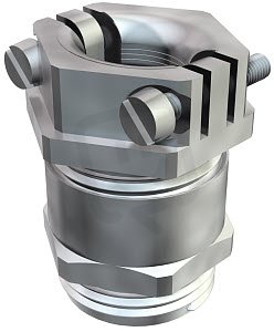 Kabelová vývodka s příčný, centricky působícím třmenovým odlehčením tahu, zaobleným hrdlem (ochrana ohybu kabelu).