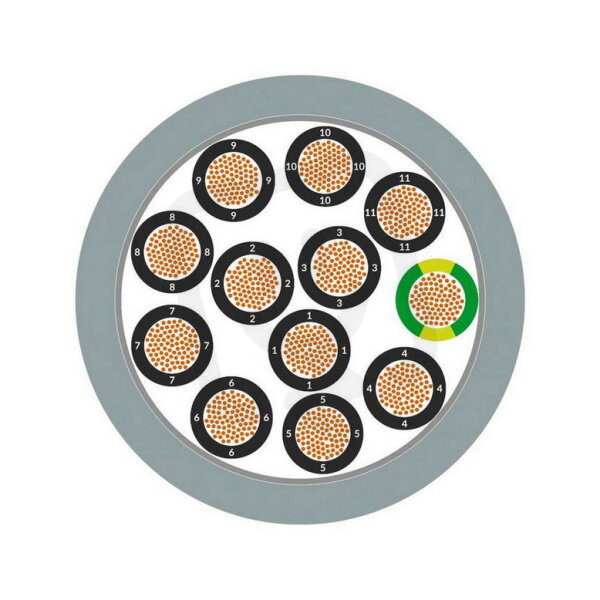 Vodiče z mědi s holým povrchem mají izolaci z PVC, vnější plášť z PUR (polyuretan) je šedý, žíly jsou označeny číslováním, kabel obsahuje ochranný vodič a není odolný vůči oleji; specifikace izolace žíly: jiné, specifikace vnějšího pláště: jiné.