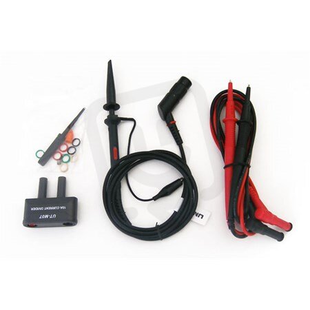 Standartní příslušenství: DC adaptér, Testovací hroty, osciloskopická sonda s přepínaním zeslabení 1x/10x, 10A proudový dělič, napájecí přívod, USB kabel, PC software na CD