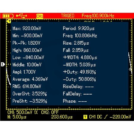 - automatické měření: peak-to-peak, amplitude, maximum, minimum, top, bottom, mean, average, root mean square, overshoot, preshoot, frequency, cycle, rising time, falling time, positive pulse, negative pulse, positive duty ratio, negative duty ratio, rise delay, fall delay