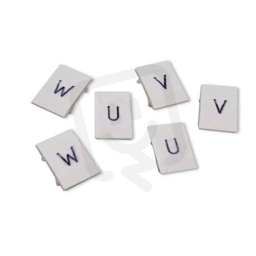 Popisovací štítky - 6 oddělených popisovacích štítků s popisem U / V / W (každé písmenko dvakrát). Slouží jako příslušentsví ke stožárovým výzbrojím, pořadí štítků na výzbroji je možné dle potřeby přehazovat Velikost štítků vhodná pro SV x.6.y ÷ SV x.35.y.