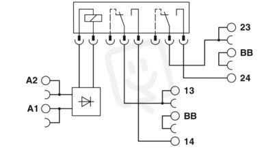 PLC-INTERFACE pro výstupní funkce, sestávající ze svornicové základny PLC-BSC.../ACT se šroubovým připojením a zásuvným miniaturním relé s výkonovým kontaktem, k montáži na nosnou lištu NS 35/7,5, 2 spínací kontakty (1-1), vstupní napětí 24 V DC