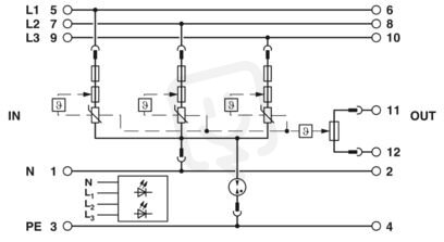 Výměnná přístrojová ochrana, podle Typ 3 třídy III, pro 3fázové napájecí sítě se samostatným N a PE (5vodičová soustava: L1, L2, L3, N, PE), s integrovanou pojistkou odolnou vůči rázovému proudu a s kontaktem dálkového hlášení.