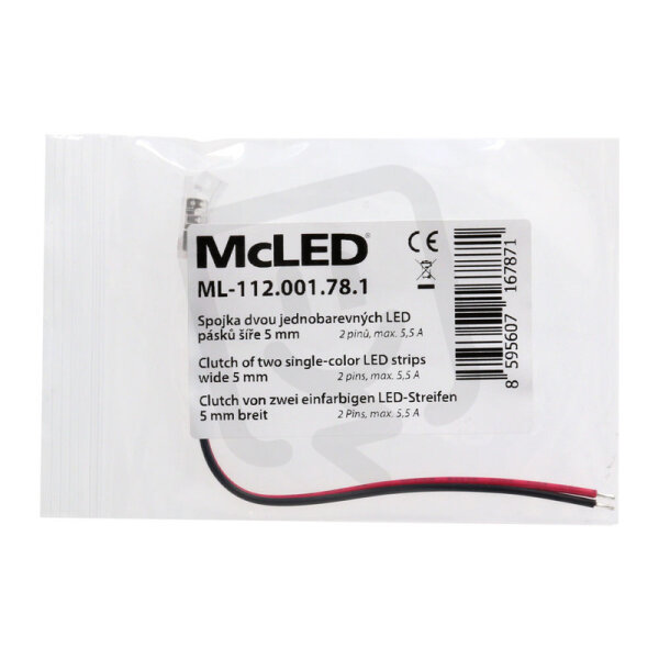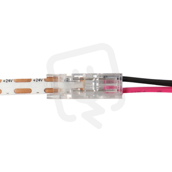 Připojovací konektor jednobarevných COB LED pásků šíře 5 mm, 2 piny, délka 150 mm, 20AWG, vodiče černý/červený, max. 5,5 A, Rozměry konektoru cca: šíře 7,8 x délka 19,5 x výška 6,4 mm. Transparentní plast. Slouží k připojení COB LED pásků k řízení bez nutnosti pájení. Po nacvaknutí lze použít opakovaně. Konektor nasaďte tak, aby piny dosedly na pájecí plošky LED pásku!