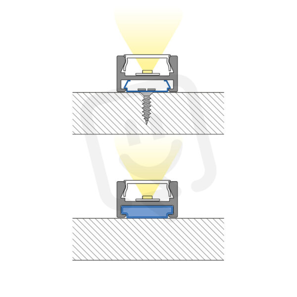 Přisazený hliníkový profil pro LED pásky, rozměry průřezu cca 15x9 mm. Součástí je mléčný difuzor, který lze do profilu nacvaknout. Tento profil je určen pro krytí a chlazení LED pásků do šíře 10 mm. Upevnění k podkladu lze provést pomocí vrutů, lepidel. Upevnění lze též provést magnetickým úchytem. K profilu lze zakoupit koncovky.