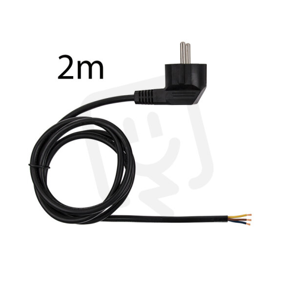 Přívodní kulatý kabel - flexo šňůra H05VV-F, s úhlovou vidlicí, 3x1mm2, černý, volné konce. Délka 2 metry. Barva izolace vnitřních vodičů: hnědá, modrá, zelenožlutá.