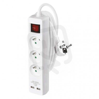 Prodlužovací přívod s vypínačem. 250V~/16A max. 3 zásuvky s dětskými clonkami. 2 x USB 2,1 A max. Délka přívodního kabelu 2 m. Vodič H05VV-F3G 1,5mm².