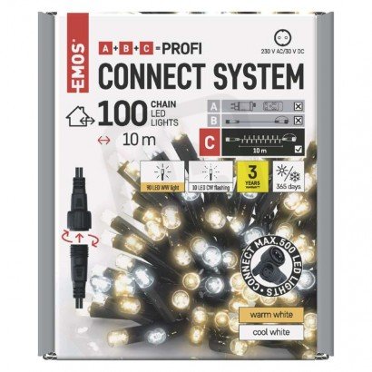 PROFI-CONN CHAIN 100LED 10M-BLACK IP44 najdete v kategoriích Svítidla, Vánoční, dekorativní a párty osvětlení, Svítidla, světelné zdroje a LED osvětlení, výrobce Emos, EAN 8592920094655, kód dodavatele D2AN01. Profi LED spojovací řetěz problikávající 10 m venkovní teplá/studená bílá D2AN01 nabízíme od 1 ks. Kód EMAS PROFI-CONN CHAIN 100LED 10M-BLACK IP44 je ELSVOS1134019.