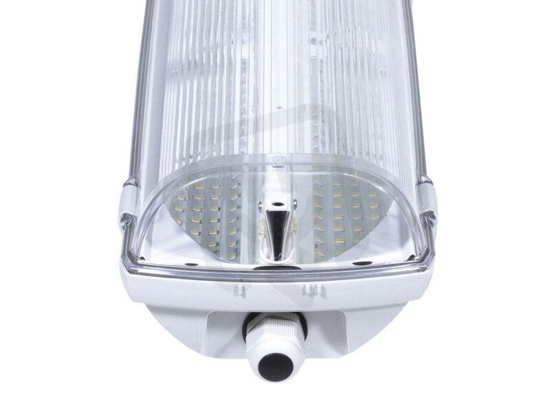 Plastové průmyslové LED svítidlo vhodné pro regálové uličky s vysokými stropy, s difuzorem z translucentního polykarbonátu.