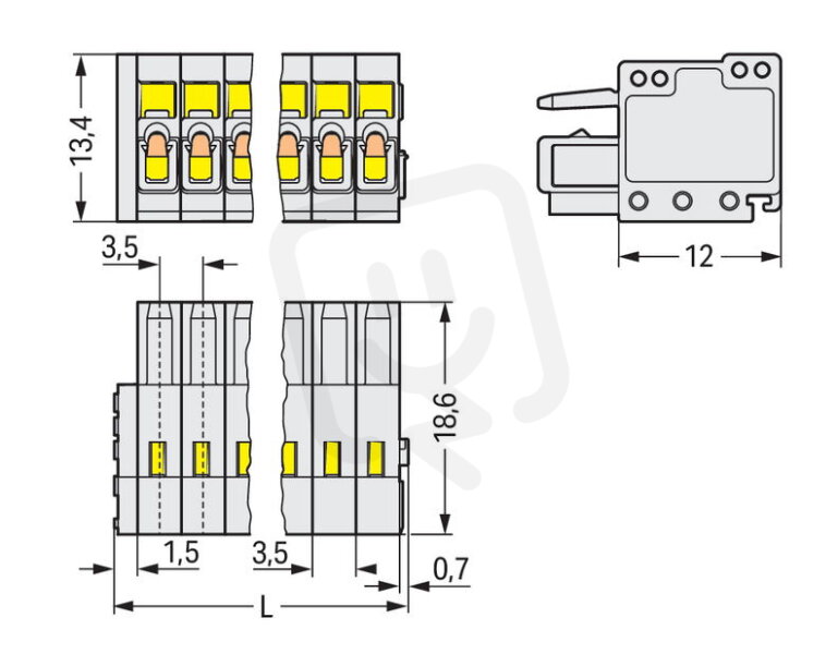 - Úhlové připojení kontaktu/vodiče: