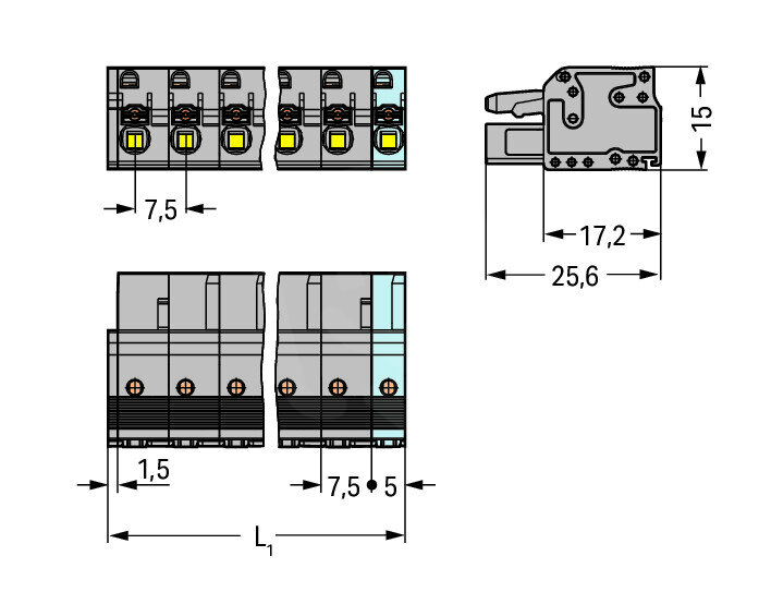 - Úhlové připojení kontaktu/vodiče: