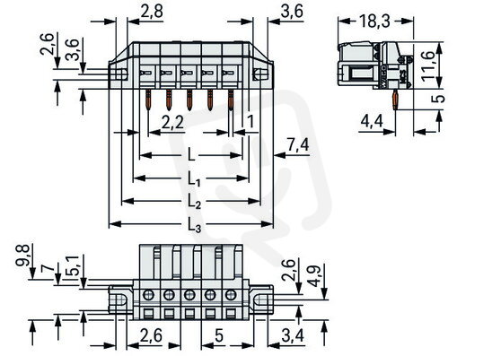 Pružinová svorkovnice THT úhlová 5 mm šedá 16pól. WAGO 722-246/031-000