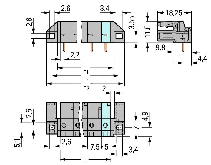 Pružinová svorkovnice THT úhlová 7,5 mm šedá 10pól. WAGO 232-840/047-000