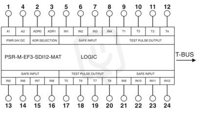 Bezpečnostní rozšiřující modul s 12 zabezpečenými vstupy k monitorování rohoží a spínacích lišt, rozhraním TBUS, do SIL 3, kat. 4/PL e, výměnná svornice push-in, včetně konektoru TBUS