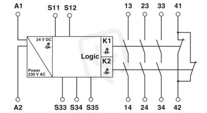 Bezpečnostní relé dohledu nouzového zastavení a ochranných dveří do SIL 1, kat. 1, PL c, v závislosti na aplikaci do SIL 3, kat. 4, PL e, jednokanálový provoz, 3 povolovací cesty proudu, vstupní jmenovité napětí 230 V AC, výměnné šroubové svornice