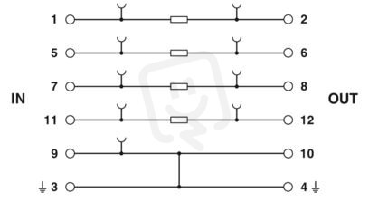 Základna pro ochrannou hlavici PT s ochranným obvodem pro čtyři vodiče signálových obvodů uzemněných na jedné straně, můstek mezi přípojkami 3-4 (GND) a 9-10, montáž na NS 35/7,5 a NS 35/15, šířka pouzdra: 17,5 mm