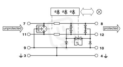 Přepěťová ochrana, sestávající z ochranného konektoru a základny, s integrovaným vícestupňovým ukazatelem stavu na modulu pro tři signálové vodiče se společným referenčním napětím. Pro VF aplikace a telekomunikační rozhraní bez napájecího napětí (až do 90 Mbit/s). Lze použít v bezpečnostních obvodech do SIL 3.