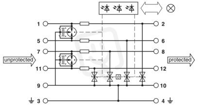 Přepěťová ochrana sestávající z ochranného konektoru a základního prvku, s integrovaným vícestupňovým ukazatelem stavu na modulu pro čtyři signálové vodiče se společným referenčním napětím. Lze použít v bezpečnostních obvodech do SIL 3.