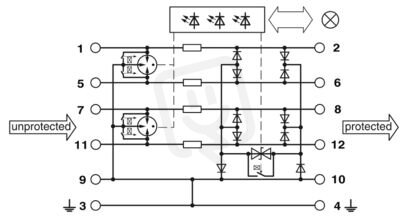 Přepěťová ochrana, sestávající z ochranného konektoru a základny, s integrovaným vícestupňovým ukazatelem stavu na modulu pro pět signálových vodičů. Pro VF aplikace a telekomunikační rozhraní bez napájecího napětí (až do 90 Mbit/s). Lze použít v bezpečnostních obvodech do SIL 3.