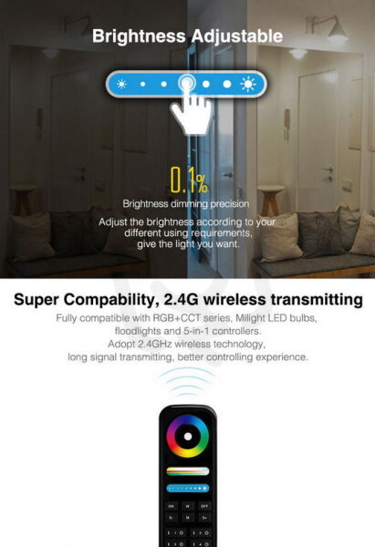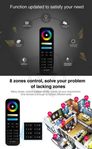 - Lze ovládat všechny typy LED pásků - jednobarevné, CCT, RGB, RGBW i RGB+CCT.
