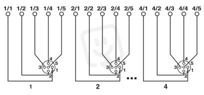 Rozvodná skříň, typ připojení: M12 s dutinkami Kov, počet zásuvných míst: 4, počet pólů: 5, kódování: A, obsazení zásuvného místa: paralelní, ukazatel stavu: ne, Univerzální; přípojka kmenového vedení: Výměnné šroubové připojení 180°, stínění: ne