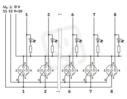 Rozvodná skříň, aplikace: Standard, typ připojení: M12 s dutinkami Plast, počet zásuvných míst: 6, počet pólů: 4, kódování: A, obsazení zásuvného místa: jednoduché, ukazatel stavu: ano, PNP; přípojka kmenového vedení: Zástrčka M23 90°, stínění: ne