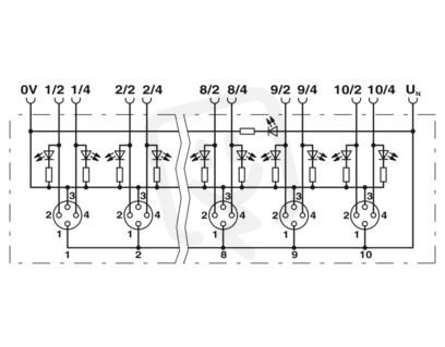 Rozvodná skříň, aplikace: Standard, typ připojení: Dutinka M8 Kov, počet zásuvných míst: 8, počet pólů: 4, kódování: A, obsazení zásuvného místa: dvojité, ukazatel stavu: ano, PNP; přípojka kmenového vedení: Výměnné šroubové připojení 180°, PUR/PVC, délka vedení: 20 m, stínění: ne
