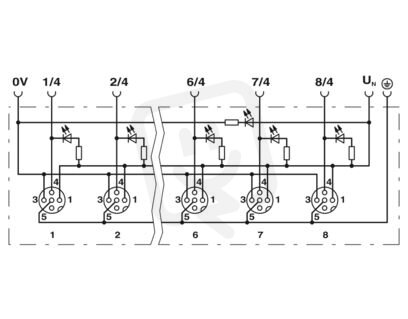 Rozvodná skříň, typ připojení: M12 s dutinkami Plast, počet zásuvných míst: 8, počet pólů: 4, kódování: A, obsazení zásuvného místa: jednoduché, ukazatel stavu: ano, npn; přípojka kmenového vedení: Pevná přípojka 180°, PUR/PVC, délka vedení: 5 m, stínění: ne