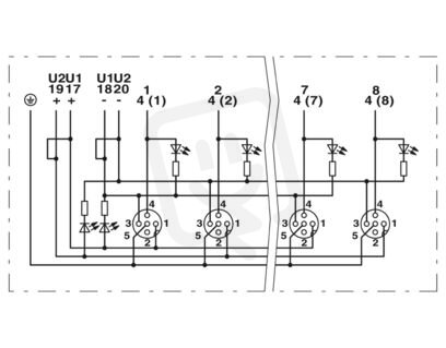 Rozvodná skříň, aplikace: Standardní, rozšířené požadavky, typ připojení: M12 s dutinkami Kov, počet zásuvných míst: 8, počet pólů: 4, kódování: A, obsazení zásuvného místa: jednoduché, ukazatel stavu: ano, PNP; přípojka kmenového vedení: Výměnné šroubové připojení 180°, stínění: ne