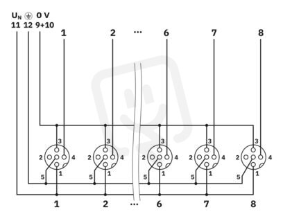Rozvodná skříň, aplikace: Standard, typ připojení: M12 s dutinkami Plast, počet zásuvných míst: 8, počet pólů: 4, kódování: A, obsazení zásuvného místa: jednoduché, ukazatel stavu: ne, Univerzální; přípojka kmenového vedení: Zástrčka M23 90°, stínění: ne
