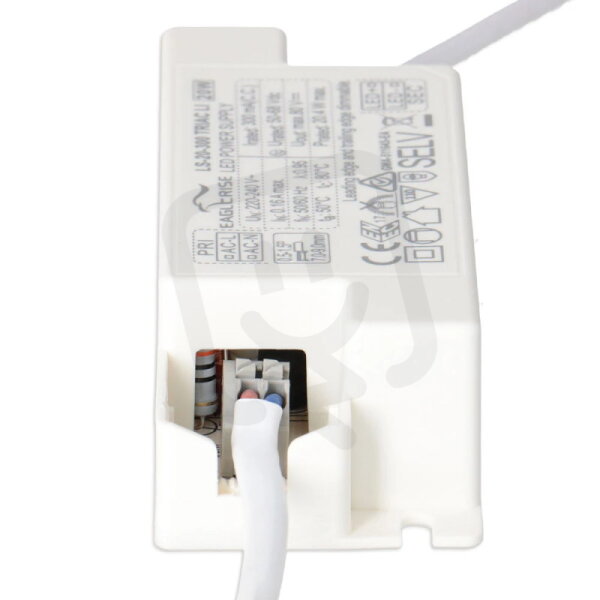 Regulovatelný SELV zdroj konstantního proudu k LED svítidlům, fázově řiditelný externím stmívačem s regulací na náběžné hraně (leading edge LE) nebo sestupné hraně (trailing edge TE). Maximální výkon 20W, PF min 0,9, vstupní napětí AC 220-240V 50/60Hz, výstupní napětí DC 50-68V, výstupní proud 300mA. Rozměry 116x43x28mm, IP20, materiál plast. Zdroj disponuje integrovanou ochranou proti zkratu, přetížení i přehřátí.