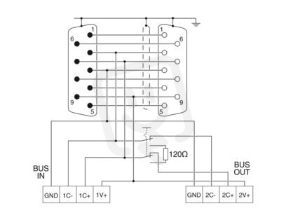 Konektor D-SUB, 9pólová zásuvka, dva 35° kabelové vývody na dvě řady svornic, sběrnicový systém: CAN, CANopen®, SafetyBus-P do 1 MBit/s, zakončovací odpor připojitelný přes posuvný spínač, obsazené kontakty: 2, 3, 7, 9; svornice se šroubovým spojem